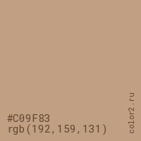 Цвет #C09F83 в цветовой модели RGB обозначается тремя октетами (192, 159, 131) в десятичном формате и #C09F83 в шестнадцатиричном (hex) формате, которые являются интенсивностью красного 192 (hex C0), интенсивность зелёного 159 (hex 9F) и интенсивность синего 131 (hex 83).