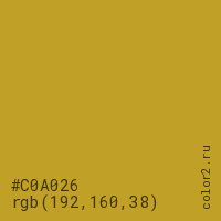 Цвет #C0A026 в цветовой модели RGB обозначается тремя октетами (192, 160, 38) в десятичном формате и #C0A026 в шестнадцатиричном (hex) формате, которые являются интенсивностью красного 192 (hex C0), интенсивность зелёного 160 (hex A0) и интенсивность синего 38 (hex 26).