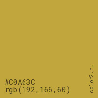 Цвет #C0A63C в цветовой модели RGB обозначается тремя октетами (192, 166, 60) в десятичном формате и #C0A63C в шестнадцатиричном (hex) формате, которые являются интенсивностью красного 192 (hex C0), интенсивность зелёного 166 (hex A6) и интенсивность синего 60 (hex 3C).