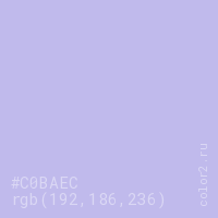 Цвет #C0BAEC в цветовой модели RGB обозначается тремя октетами (192, 186, 236) в десятичном формате и #C0BAEC в шестнадцатиричном (hex) формате, которые являются интенсивностью красного 192 (hex C0), интенсивность зелёного 186 (hex BA) и интенсивность синего 236 (hex EC).