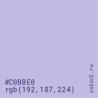 Цвет #C0BBE0 в цветовой модели RGB обозначается тремя октетами (192, 187, 224) в десятичном формате и #C0BBE0 в шестнадцатиричном (hex) формате, которые являются интенсивностью красного 192 (hex C0), интенсивность зелёного 187 (hex BB) и интенсивность синего 224 (hex E0).