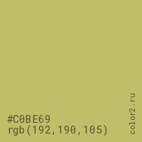 Цвет #C0BE69 в цветовой модели RGB обозначается тремя октетами (192, 190, 105) в десятичном формате и #C0BE69 в шестнадцатиричном (hex) формате, которые являются интенсивностью красного 192 (hex C0), интенсивность зелёного 190 (hex BE) и интенсивность синего 105 (hex 69).