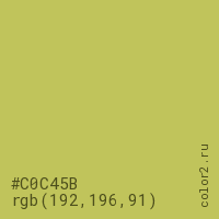 Цвет #C0C45B в цветовой модели RGB обозначается тремя октетами (192, 196, 91) в десятичном формате и #C0C45B в шестнадцатиричном (hex) формате, которые являются интенсивностью красного 192 (hex C0), интенсивность зелёного 196 (hex C4) и интенсивность синего 91 (hex 5B).