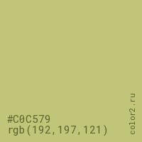 Цвет #C0C579 в цветовой модели RGB обозначается тремя октетами (192, 197, 121) в десятичном формате и #C0C579 в шестнадцатиричном (hex) формате, которые являются интенсивностью красного 192 (hex C0), интенсивность зелёного 197 (hex C5) и интенсивность синего 121 (hex 79).