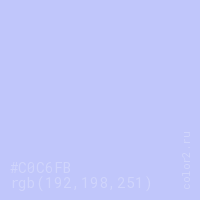 Цвет RGB(192, 198, 251) в процентом отношении количества цвета состоит из 75.3% красного (red), 77.6% зелёного (green) и 98.4% синего (blue).