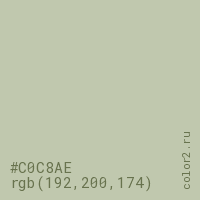 Цвет #C0C8AE в цветовой модели RGB обозначается тремя октетами (192, 200, 174) в десятичном формате и #C0C8AE в шестнадцатиричном (hex) формате, которые являются интенсивностью красного 192 (hex C0), интенсивность зелёного 200 (hex C8) и интенсивность синего 174 (hex AE).