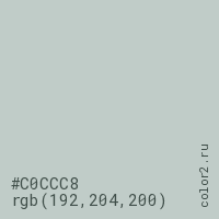 Цвет #C0CCC8 в цветовой модели RGB обозначается тремя октетами (192, 204, 200) в десятичном формате и #C0CCC8 в шестнадцатиричном (hex) формате, которые являются интенсивностью красного 192 (hex C0), интенсивность зелёного 204 (hex CC) и интенсивность синего 200 (hex C8).