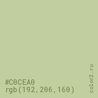 Цвет #C0CEA0 в цветовой модели RGB обозначается тремя октетами (192, 206, 160) в десятичном формате и #C0CEA0 в шестнадцатиричном (hex) формате, которые являются интенсивностью красного 192 (hex C0), интенсивность зелёного 206 (hex CE) и интенсивность синего 160 (hex A0).