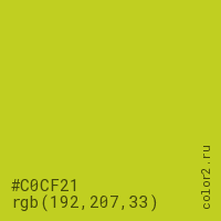Цвет #C0CF21 в цветовой модели RGB обозначается тремя октетами (192, 207, 33) в десятичном формате и #C0CF21 в шестнадцатиричном (hex) формате, которые являются интенсивностью красного 192 (hex C0), интенсивность зелёного 207 (hex CF) и интенсивность синего 33 (hex 21).