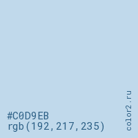 Цвет RGB(192, 217, 235) в процентом отношении количества цвета состоит из 75.3% красного (red), 85.1% зелёного (green) и 92.2% синего (blue).