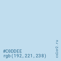 Цвет #C0DDEE в цветовой модели RGB обозначается тремя октетами (192, 221, 238) в десятичном формате и #C0DDEE в шестнадцатиричном (hex) формате, которые являются интенсивностью красного 192 (hex C0), интенсивность зелёного 221 (hex DD) и интенсивность синего 238 (hex EE).