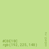 Цвет #C0E18C в цветовой модели RGB обозначается тремя октетами (192, 225, 140) в десятичном формате и #C0E18C в шестнадцатиричном (hex) формате, которые являются интенсивностью красного 192 (hex C0), интенсивность зелёного 225 (hex E1) и интенсивность синего 140 (hex 8C).