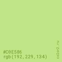 Цвет #C0E586 в цветовой модели RGB обозначается тремя октетами (192, 229, 134) в десятичном формате и #C0E586 в шестнадцатиричном (hex) формате, которые являются интенсивностью красного 192 (hex C0), интенсивность зелёного 229 (hex E5) и интенсивность синего 134 (hex 86).