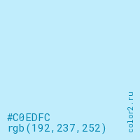 Цвет #C0EDFC в цветовой модели RGB обозначается тремя октетами (192, 237, 252) в десятичном формате и #C0EDFC в шестнадцатиричном (hex) формате, которые являются интенсивностью красного 192 (hex C0), интенсивность зелёного 237 (hex ED) и интенсивность синего 252 (hex FC).