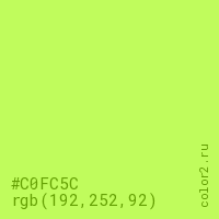 Цвет #C0FC5C в цветовой модели RGB обозначается тремя октетами (192, 252, 92) в десятичном формате и #C0FC5C в шестнадцатиричном (hex) формате, которые являются интенсивностью красного 192 (hex C0), интенсивность зелёного 252 (hex FC) и интенсивность синего 92 (hex 5C).