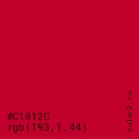 Цвет #C1012C в цветовой модели RGB обозначается тремя октетами (193, 1, 44) в десятичном формате и #C1012C в шестнадцатиричном (hex) формате, которые являются интенсивностью красного 193 (hex C1), интенсивность зелёного 1 (hex 01) и интенсивность синего 44 (hex 2C).