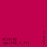 Цвет #C1014D в цветовой модели RGB обозначается тремя октетами (193, 1, 77) в десятичном формате и #C1014D в шестнадцатиричном (hex) формате, которые являются интенсивностью красного 193 (hex C1), интенсивность зелёного 1 (hex 01) и интенсивность синего 77 (hex 4D).