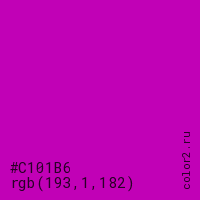 Цвет #C101B6 в цветовой модели RGB обозначается тремя октетами (193, 1, 182) в десятичном формате и #C101B6 в шестнадцатиричном (hex) формате, которые являются интенсивностью красного 193 (hex C1), интенсивность зелёного 1 (hex 01) и интенсивность синего 182 (hex B6).