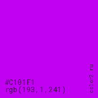 Цвет #C101F1 в цветовой модели RGB обозначается тремя октетами (193, 1, 241) в десятичном формате и #C101F1 в шестнадцатиричном (hex) формате, которые являются интенсивностью красного 193 (hex C1), интенсивность зелёного 1 (hex 01) и интенсивность синего 241 (hex F1).
