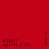 Цвет #C10217 в цветовой модели RGB обозначается тремя октетами (193, 2, 23) в десятичном формате и #C10217 в шестнадцатиричном (hex) формате, которые являются интенсивностью красного 193 (hex C1), интенсивность зелёного 2 (hex 02) и интенсивность синего 23 (hex 17).