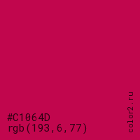 Цвет #C1064D в цветовой модели RGB обозначается тремя октетами (193, 6, 77) в десятичном формате и #C1064D в шестнадцатиричном (hex) формате, которые являются интенсивностью красного 193 (hex C1), интенсивность зелёного 6 (hex 06) и интенсивность синего 77 (hex 4D).