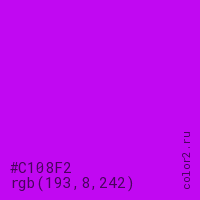 Цвет #C108F2 в цветовой модели RGB обозначается тремя октетами (193, 8, 242) в десятичном формате и #C108F2 в шестнадцатиричном (hex) формате, которые являются интенсивностью красного 193 (hex C1), интенсивность зелёного 8 (hex 08) и интенсивность синего 242 (hex F2).