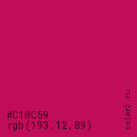 Цвет #C10C59 в цветовой модели RGB обозначается тремя октетами (193, 12, 89) в десятичном формате и #C10C59 в шестнадцатиричном (hex) формате, которые являются интенсивностью красного 193 (hex C1), интенсивность зелёного 12 (hex 0C) и интенсивность синего 89 (hex 59).