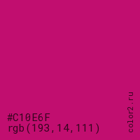 Цвет #C10E6F в цветовой модели RGB обозначается тремя октетами (193, 14, 111) в десятичном формате и #C10E6F в шестнадцатиричном (hex) формате, которые являются интенсивностью красного 193 (hex C1), интенсивность зелёного 14 (hex 0E) и интенсивность синего 111 (hex 6F).
