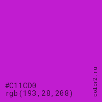 Цвет #C11CD0 в цветовой модели RGB обозначается тремя октетами (193, 28, 208) в десятичном формате и #C11CD0 в шестнадцатиричном (hex) формате, которые являются интенсивностью красного 193 (hex C1), интенсивность зелёного 28 (hex 1C) и интенсивность синего 208 (hex D0).