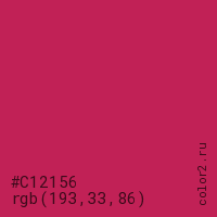 Цвет #C12156 в цветовой модели RGB обозначается тремя октетами (193, 33, 86) в десятичном формате и #C12156 в шестнадцатиричном (hex) формате, которые являются интенсивностью красного 193 (hex C1), интенсивность зелёного 33 (hex 21) и интенсивность синего 86 (hex 56).