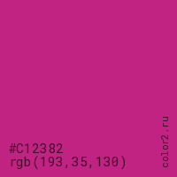 Цвет #C12382 в цветовой модели RGB обозначается тремя октетами (193, 35, 130) в десятичном формате и #C12382 в шестнадцатиричном (hex) формате, которые являются интенсивностью красного 193 (hex C1), интенсивность зелёного 35 (hex 23) и интенсивность синего 130 (hex 82).