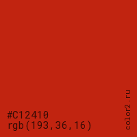 Цвет #C12410 в цветовой модели RGB обозначается тремя октетами (193, 36, 16) в десятичном формате и #C12410 в шестнадцатиричном (hex) формате, которые являются интенсивностью красного 193 (hex C1), интенсивность зелёного 36 (hex 24) и интенсивность синего 16 (hex 10).