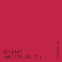 Цвет #C12447 в цветовой модели RGB обозначается тремя октетами (193, 36, 71) в десятичном формате и #C12447 в шестнадцатиричном (hex) формате, которые являются интенсивностью красного 193 (hex C1), интенсивность зелёного 36 (hex 24) и интенсивность синего 71 (hex 47).
