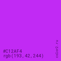Цвет #C12AF4 в цветовой модели RGB обозначается тремя октетами (193, 42, 244) в десятичном формате и #C12AF4 в шестнадцатиричном (hex) формате, которые являются интенсивностью красного 193 (hex C1), интенсивность зелёного 42 (hex 2A) и интенсивность синего 244 (hex F4).