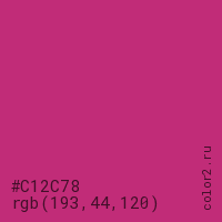 Цвет #C12C78 в цветовой модели RGB обозначается тремя октетами (193, 44, 120) в десятичном формате и #C12C78 в шестнадцатиричном (hex) формате, которые являются интенсивностью красного 193 (hex C1), интенсивность зелёного 44 (hex 2C) и интенсивность синего 120 (hex 78).