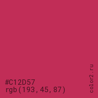 Цвет #C12D57 в цветовой модели RGB обозначается тремя октетами (193, 45, 87) в десятичном формате и #C12D57 в шестнадцатиричном (hex) формате, которые являются интенсивностью красного 193 (hex C1), интенсивность зелёного 45 (hex 2D) и интенсивность синего 87 (hex 57).