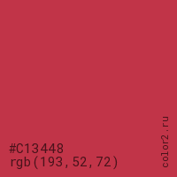 Цвет #C13448 в цветовой модели RGB обозначается тремя октетами (193, 52, 72) в десятичном формате и #C13448 в шестнадцатиричном (hex) формате, которые являются интенсивностью красного 193 (hex C1), интенсивность зелёного 52 (hex 34) и интенсивность синего 72 (hex 48).