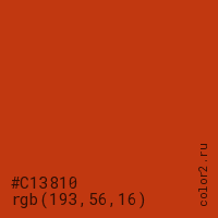 Цвет #C13810 в цветовой модели RGB обозначается тремя октетами (193, 56, 16) в десятичном формате и #C13810 в шестнадцатиричном (hex) формате, которые являются интенсивностью красного 193 (hex C1), интенсивность зелёного 56 (hex 38) и интенсивность синего 16 (hex 10).