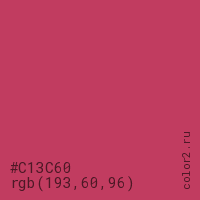 Цвет #C13C60 в цветовой модели RGB обозначается тремя октетами (193, 60, 96) в десятичном формате и #C13C60 в шестнадцатиричном (hex) формате, которые являются интенсивностью красного 193 (hex C1), интенсивность зелёного 60 (hex 3C) и интенсивность синего 96 (hex 60).