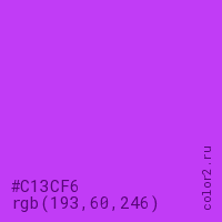 Цвет #C13CF6 в цветовой модели RGB обозначается тремя октетами (193, 60, 246) в десятичном формате и #C13CF6 в шестнадцатиричном (hex) формате, которые являются интенсивностью красного 193 (hex C1), интенсивность зелёного 60 (hex 3C) и интенсивность синего 246 (hex F6).
