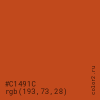 Цвет #C1491C в цветовой модели RGB обозначается тремя октетами (193, 73, 28) в десятичном формате и #C1491C в шестнадцатиричном (hex) формате, которые являются интенсивностью красного 193 (hex C1), интенсивность зелёного 73 (hex 49) и интенсивность синего 28 (hex 1C).
