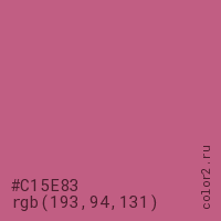 Цвет #C15E83 в цветовой модели RGB обозначается тремя октетами (193, 94, 131) в десятичном формате и #C15E83 в шестнадцатиричном (hex) формате, которые являются интенсивностью красного 193 (hex C1), интенсивность зелёного 94 (hex 5E) и интенсивность синего 131 (hex 83).
