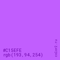 Цвет #C15EFE в цветовой модели RGB обозначается тремя октетами (193, 94, 254) в десятичном формате и #C15EFE в шестнадцатиричном (hex) формате, которые являются интенсивностью красного 193 (hex C1), интенсивность зелёного 94 (hex 5E) и интенсивность синего 254 (hex FE).
