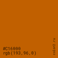 Цвет #C16000 в цветовой модели RGB обозначается тремя октетами (193, 96, 0) в десятичном формате и #C16000 в шестнадцатиричном (hex) формате, которые являются интенсивностью красного 193 (hex C1), интенсивность зелёного 96 (hex 60) и интенсивность синего 0 (hex 00).