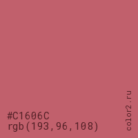 Цвет #C1606C в цветовой модели RGB обозначается тремя октетами (193, 96, 108) в десятичном формате и #C1606C в шестнадцатиричном (hex) формате, которые являются интенсивностью красного 193 (hex C1), интенсивность зелёного 96 (hex 60) и интенсивность синего 108 (hex 6C).