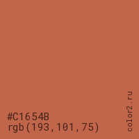 Цвет #C1654B в цветовой модели RGB обозначается тремя октетами (193, 101, 75) в десятичном формате и #C1654B в шестнадцатиричном (hex) формате, которые являются интенсивностью красного 193 (hex C1), интенсивность зелёного 101 (hex 65) и интенсивность синего 75 (hex 4B).