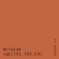 Цвет #C16640 в цветовой модели RGB обозначается тремя октетами (193, 102, 64) в десятичном формате и #C16640 в шестнадцатиричном (hex) формате, которые являются интенсивностью красного 193 (hex C1), интенсивность зелёного 102 (hex 66) и интенсивность синего 64 (hex 40).