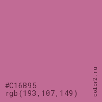 Цвет #C16B95 в цветовой модели RGB обозначается тремя октетами (193, 107, 149) в десятичном формате и #C16B95 в шестнадцатиричном (hex) формате, которые являются интенсивностью красного 193 (hex C1), интенсивность зелёного 107 (hex 6B) и интенсивность синего 149 (hex 95).