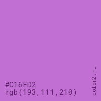 Цвет #C16FD2 в цветовой модели RGB обозначается тремя октетами (193, 111, 210) в десятичном формате и #C16FD2 в шестнадцатиричном (hex) формате, которые являются интенсивностью красного 193 (hex C1), интенсивность зелёного 111 (hex 6F) и интенсивность синего 210 (hex D2).