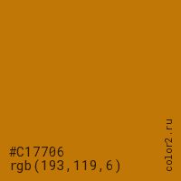 Цвет #C17706 в цветовой модели RGB обозначается тремя октетами (193, 119, 6) в десятичном формате и #C17706 в шестнадцатиричном (hex) формате, которые являются интенсивностью красного 193 (hex C1), интенсивность зелёного 119 (hex 77) и интенсивность синего 6 (hex 06).